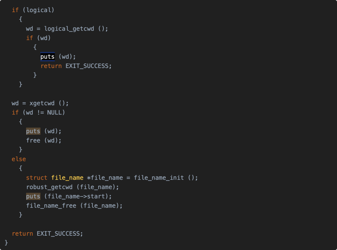 我开始怀疑pwd的源代码中会不会根本就没有调用 puts ,在和 ltrace 配合使用的时候因为一些底层缘故调用了 puts 函数,导致反弹shell,所以我去查了 pwd 的源代码