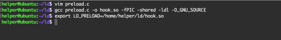 gcc preload.c -o hook.so -fPIC -shared -ldl -D_GNU_SOURCE