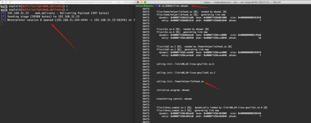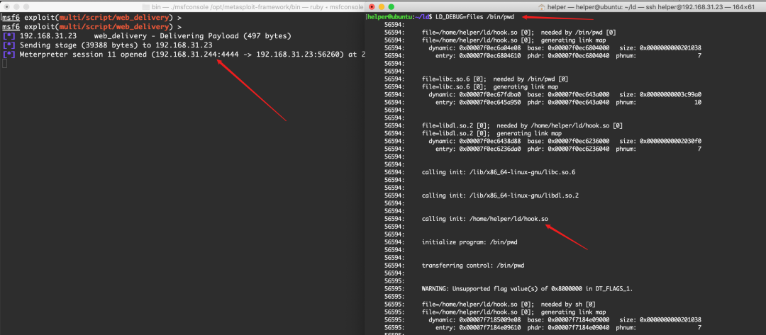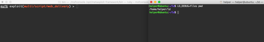 使用 LD_PRELOAD 劫持 puts 函数后,执行 whoami 就会有shell反弹到msf上,但是同样调用 puts 的 pwd 就死活弹不回来