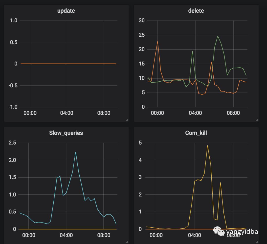 分析问题发生时候的数据库快照信息,QPS 都很低,除了差不多10 TPS 的DELETE和几十的SELECT,没有发现有问题的SQL。