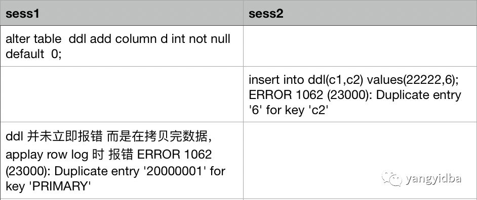 举一反三 ,其实只要是会导致重复记录的sql语句,比如update,insert,insert into... on duplicate key,replace into 都会导致添加字段、删除字段的ddl变更失败。
