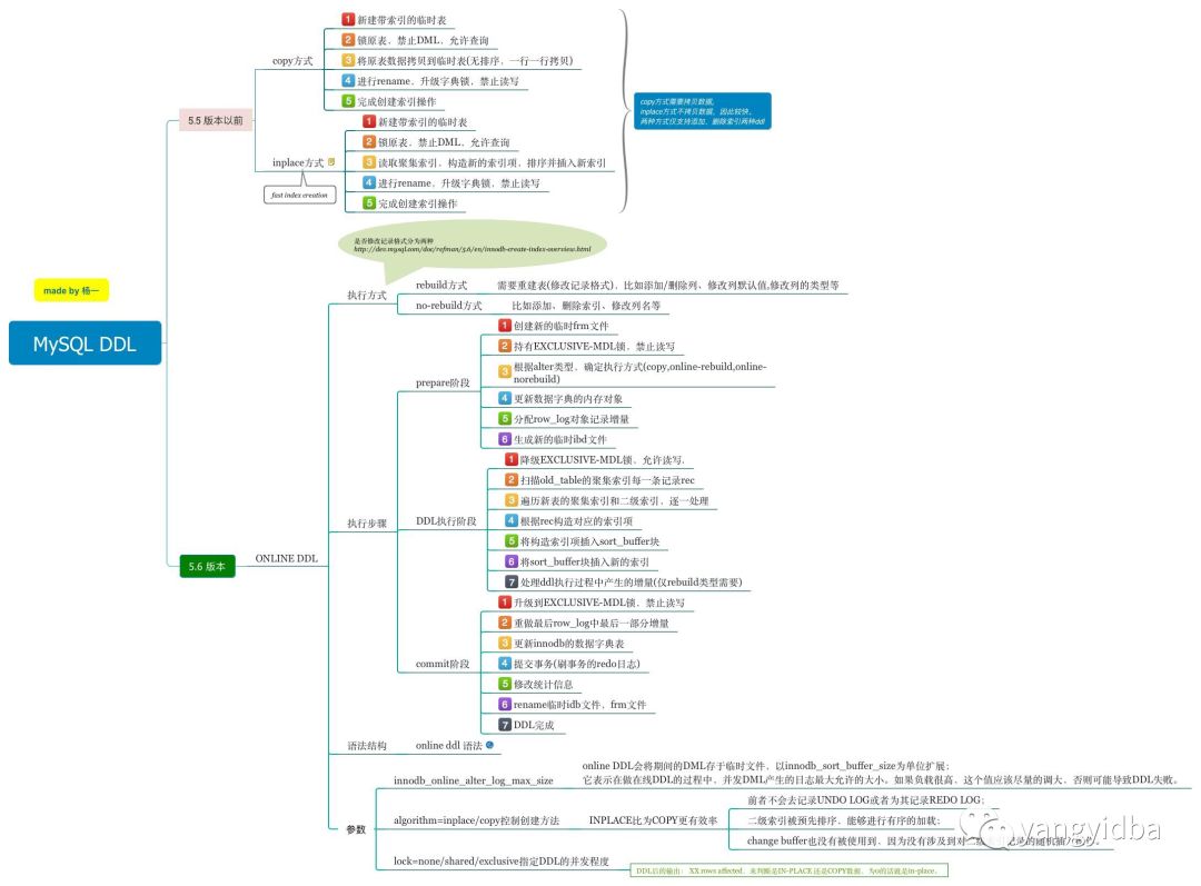 首先我们通过一个思维导图了解一下MySQL online DDL 的过程,大家注意commit阶段,会把ddl 执行期间的记录的 log 重新应用到新的表上。