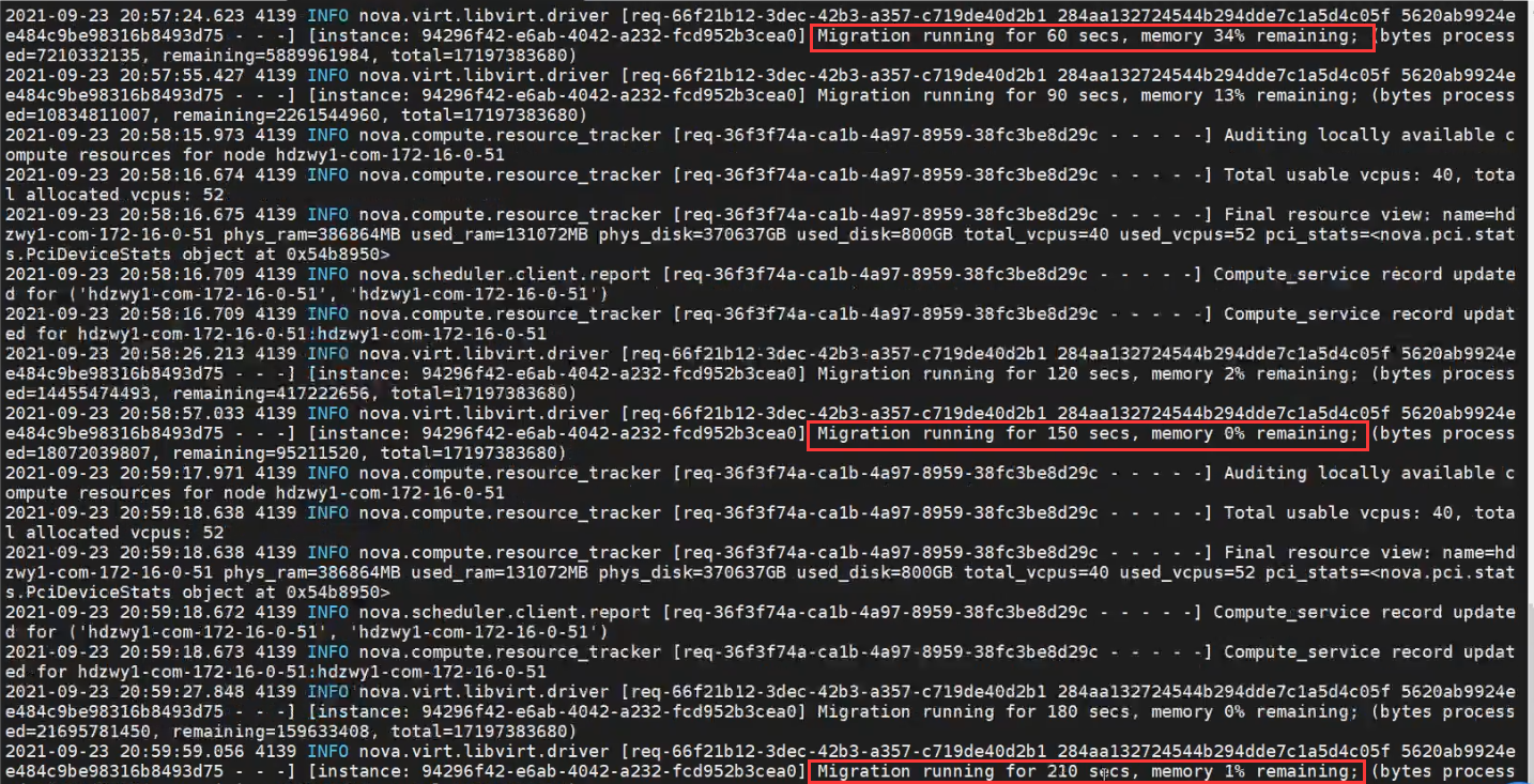 这时需要到原物理服务器查看nova日志,热迁移时日志信息30秒显示一次内存剩余迁移进度