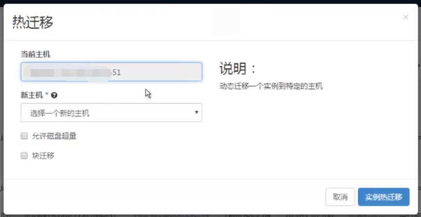首先在基础云平台操作热迁移实例,选择新主机,点击“实例热迁移”(无需选择磁盘超量和块迁移),随后一直卡在“正在迁移”这个状态。