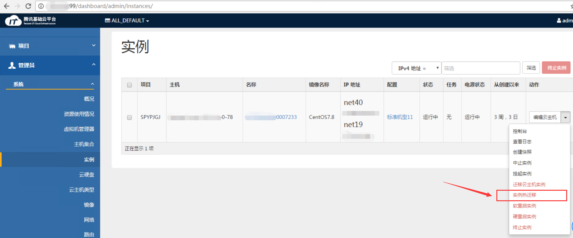 某地区腾讯云平台系统(基于OpenStack开发的TStack平台),其中一台物理服务器(计算节点)下架维护,需要将其承载的云服务器迁移到其他物理服务器,为保证业务正常运行,因此采用热迁移的方式进行操作。按照变更流程,在基础云平台(dashboard)上,可以直接对实例指定目标物理服务器进行热迁移,等待迁移完成即可,本文主要介绍若一直卡在“正在迁移”步骤的处理方法。