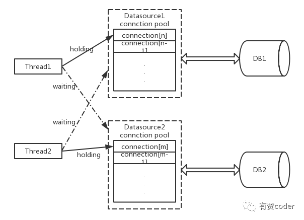业务依赖两个数据源,这里表示为 datasource1 与 datasource2,其中在部分代码段中同时开启了两个库的事务。如图1 所示,线程1 获取了 datasource1 中的最后一个连接 connection[n],等待获取 datasource2 的连接,此时线程2也正在执行类似的操作,造成了死锁等待。大家对这种互锁一定很熟悉,只是这次是发生在 DB 上。