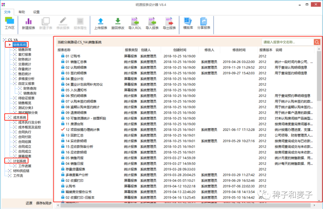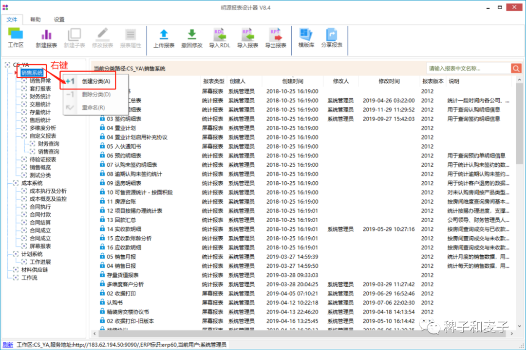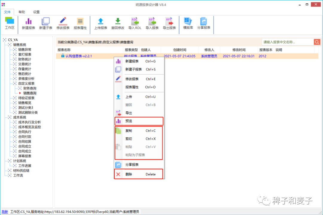 选中报表并右键,弹出右键菜单栏,大体功能同顶部菜单栏,但针对单个报表操作更快捷;针对顶层菜单栏未涉及内容,以下将逐一介绍: