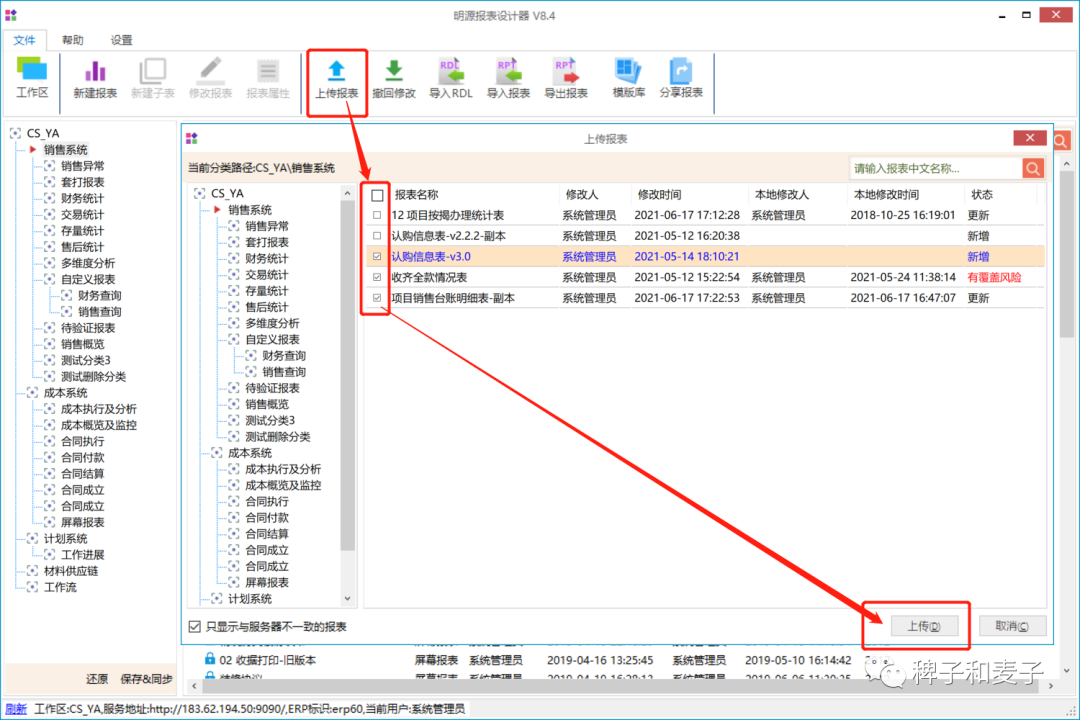 上传报表:点击【上传报表】,将弹出【上传报表】界面,可以将本地开发的报表上传并同步至ERP,支持批量上传(左下角有个参数,默认勾选“只显示与服务器不一致的报表”,便于判断哪些报表需要上传)。