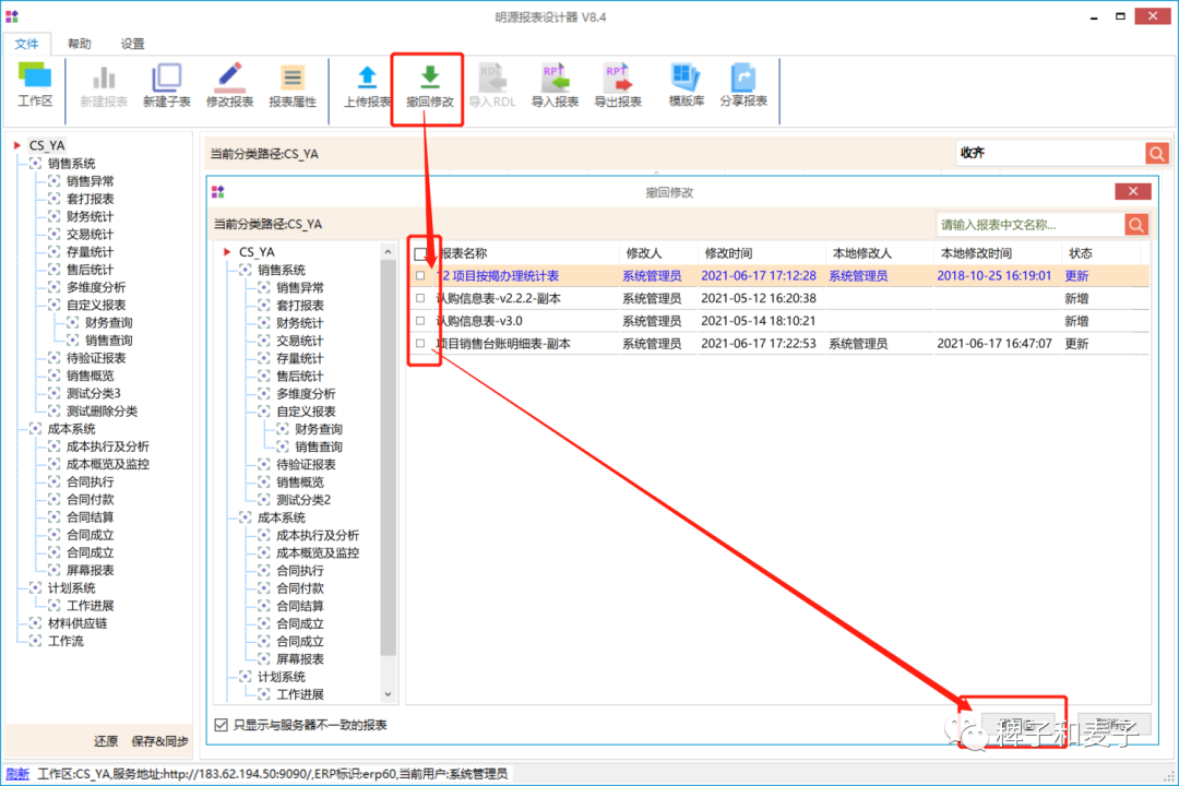 撤回修改:点击【撤回修改】,将弹出【撤回修改】界面,将ERP的报表撤回至本地进行修改,支持批量撤回(旧版本这个按钮叫“下载报表”)