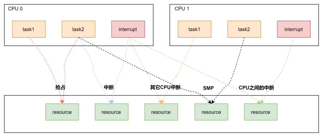 进程与进程之间:单核上的抢占,多核上的SMP; 进程与中断之间:中断又包含了上半部与下半部,中断总是能打断进程的执行流; 中断与中断之间:外设的中断可以路由到不同的CPU上,它们之间也可能带来竞态;