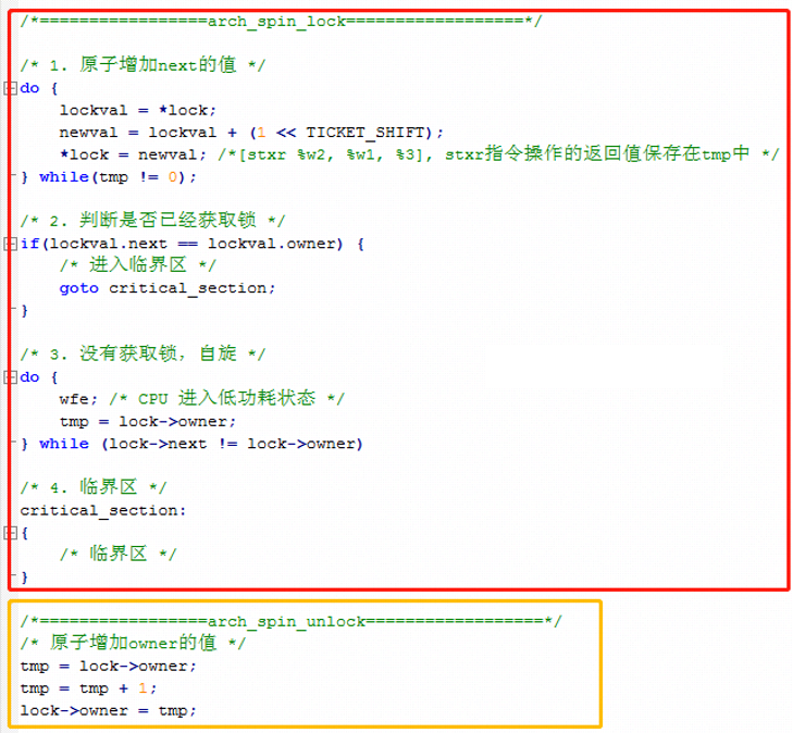 上边的代码中,核心逻辑在于 asm volatile() 内联汇编中,有很多独占的操作指令,只有基于指令的独占操作,才能保证软件上的互斥。把核心逻辑翻译成 C 语言: