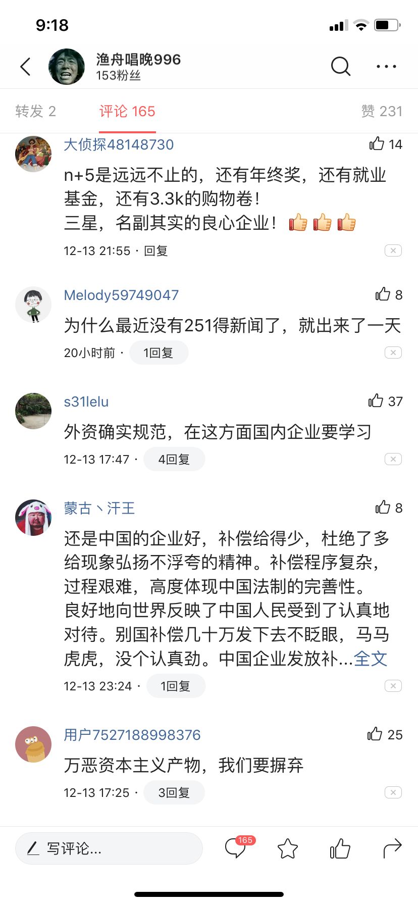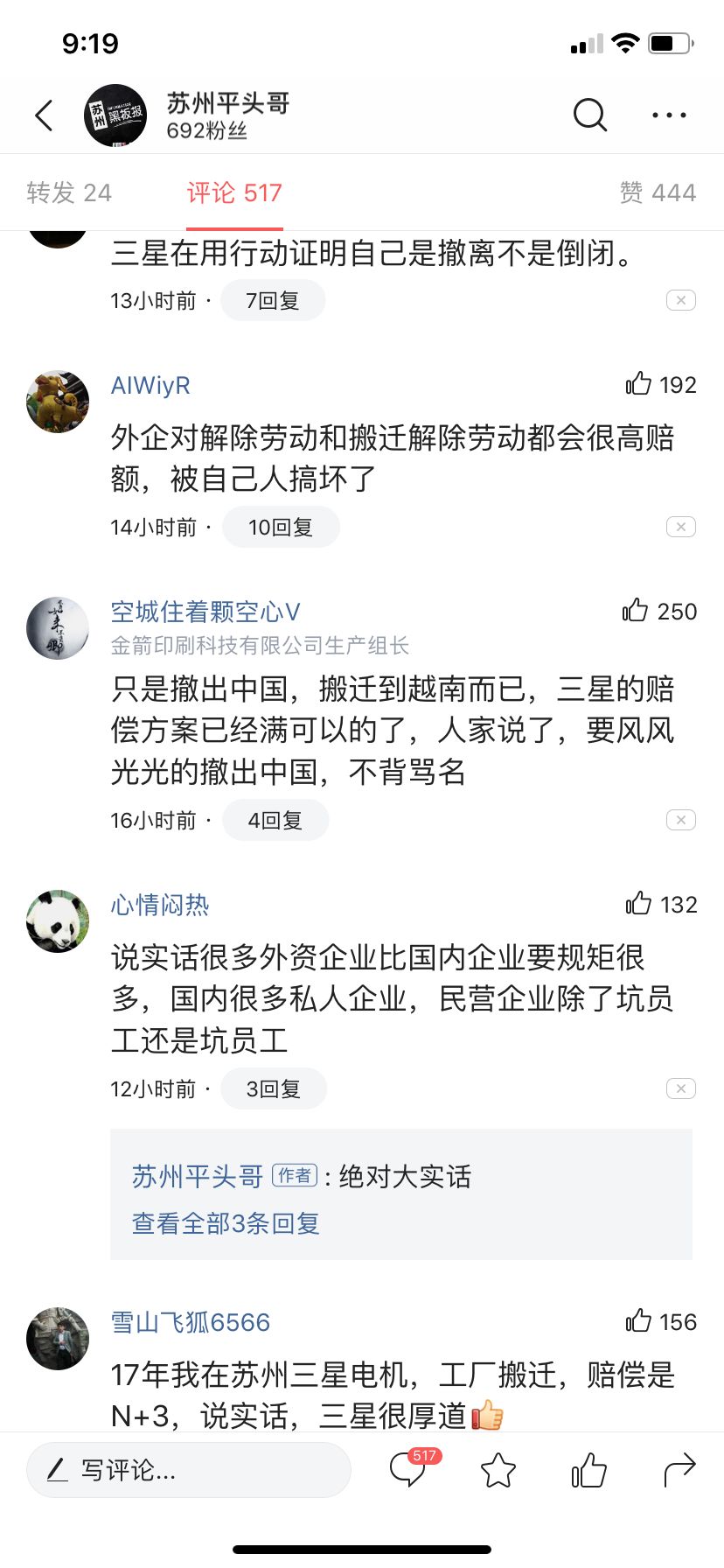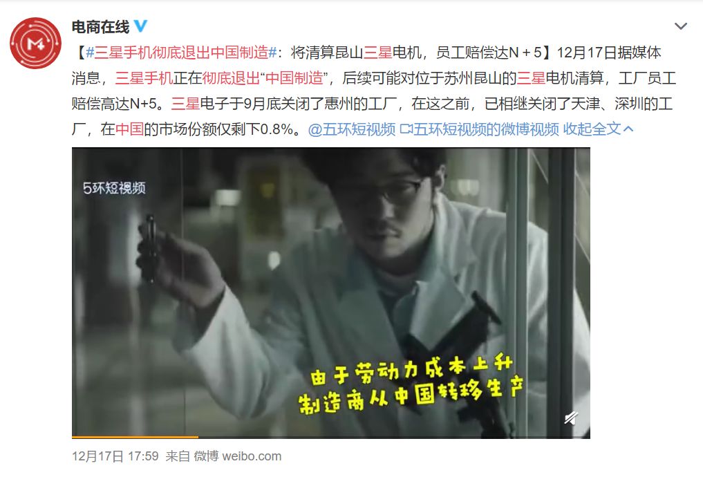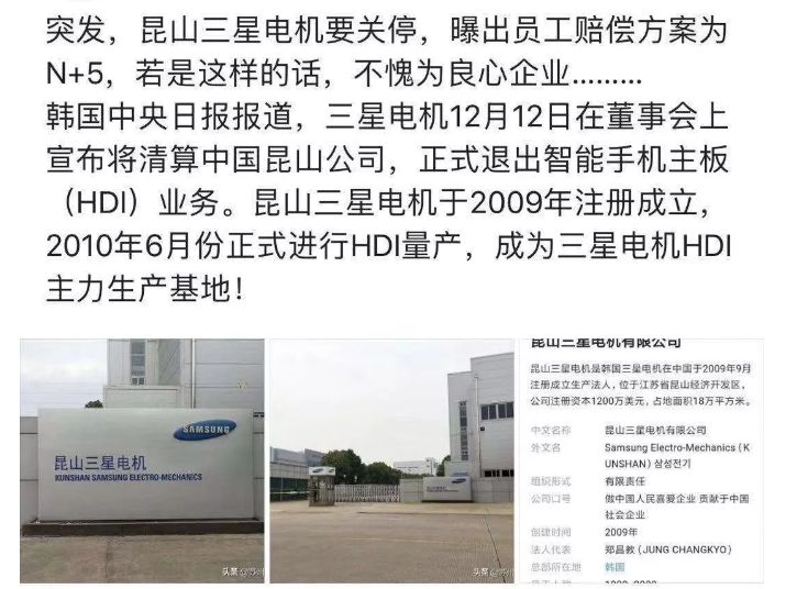 12 月 17 日据媒体消息,三星手机正在彻底退出“中国制造”,后续可能对位于苏州昆山的三星电机清算,工厂员工赔偿高达 N+5。