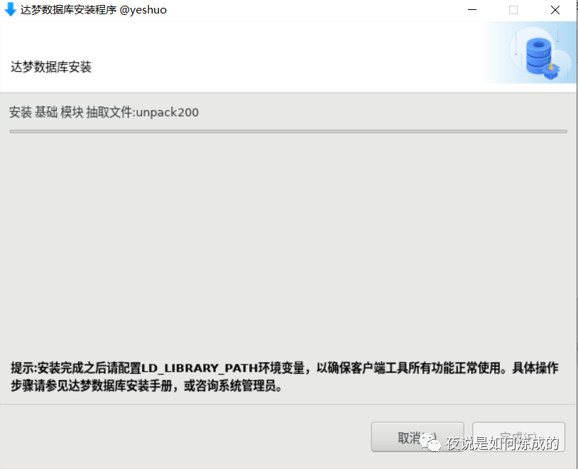 [root@yeshuo ~]# su - dmdba[dmdba@yeshuo ~]$ cd software/dm8/[dmdba@yeshuo dm8]$ ls'DM8 Install.pdf' DMInstall.bin[dmdba@yeshuo dm8]$ export DISPLAY=192.168.171.1:0.0[dmdba@yeshuo dm8]$ ./DMInstall.bin解压安装程序........