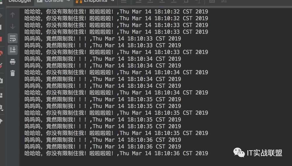备注:由于手速原因可以看到每秒超过令牌个数的直接返回“呜呜呜,竟然限制我!!!”,说明有效果。