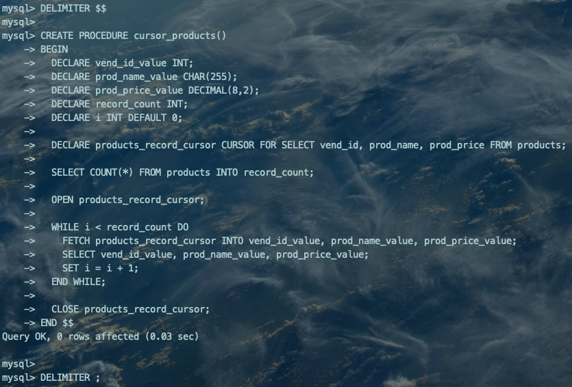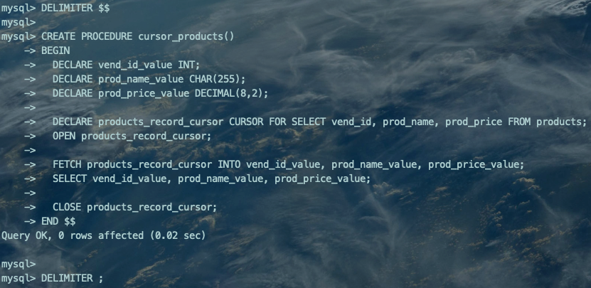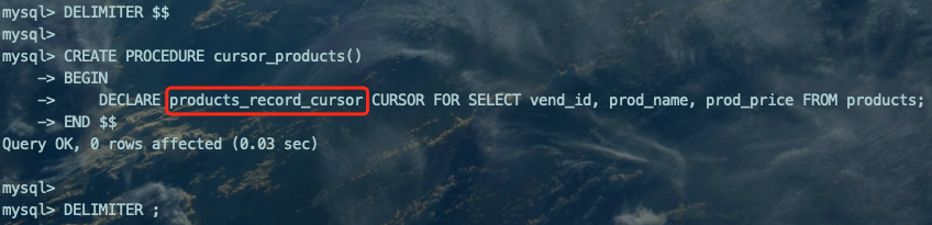 DELIMITER $$CREATE PROCEDURE cursor_products()BEGIN DECLARE products_record_cursor CURSOR FOR SELECT vend_id, prod_name, prod_price FROM products;END $$DELIMITER ;