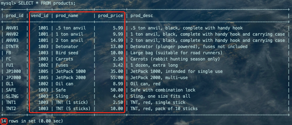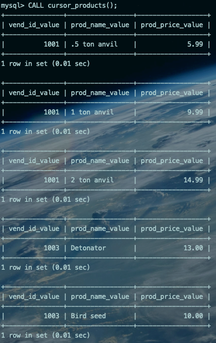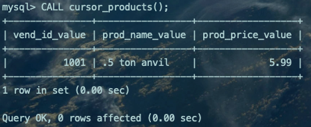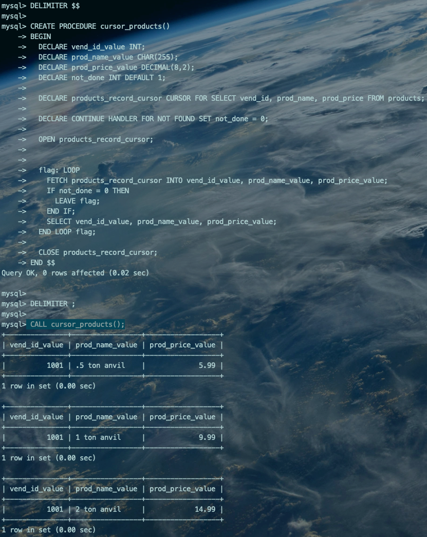 DELIMITER $$CREATE PROCEDURE cursor_products()BEGIN DECLARE vend_id_value INT; DECLARE prod_name_value CHAR(255); DECLARE prod_price_value DECIMAL(8,2); DECLARE not_done INT DEFAULT 1; DECLARE products_record_cursor CURSOR FOR SELECT vend_id, prod_name, prod_price FROM products; DECLARE CONTINUE HANDLER FOR NOT FOUND SET not_done = 0; OPEN products_record_cursor; flag: LOOP FETCH products_record_cursor INTO vend_id_value, prod_name_value, prod_price_value; IF not_done = 0 THEN LEAVE flag; END IF; SELECT vend_id_value, prod_name_value, prod_price_value; END LOOP flag; CLOSE products_record_cursor;END $$DELIMITER ;CALL cursor_products();