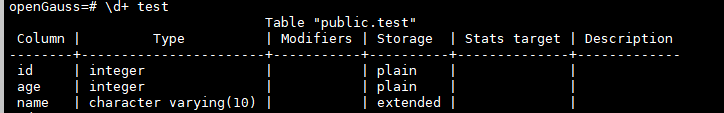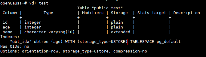 create table test(id int, name varchar(10)) with (storage_type=ustore);