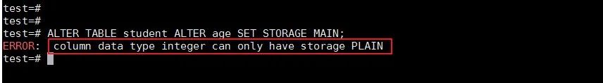 不过值得注意的是,你无法将一个不支持TOAST机制的数据类型(列)的存储策略修改为其他。比如字段age
