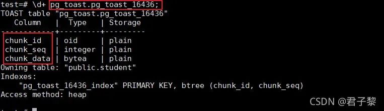 如果一张表中存在可变长数据类型,那么该表将有一个与之关联的TOAST表。TOAST是一张单独的表,专用于存储大块数据的列。比如表student