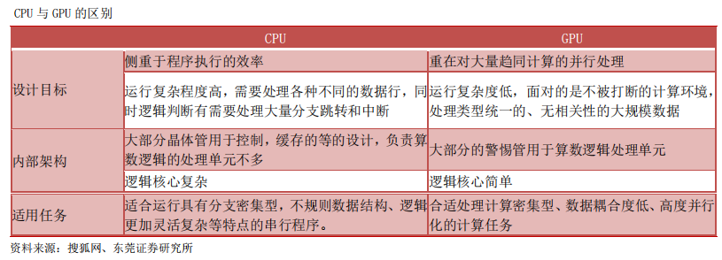 CPU 一般由逻辑运算单元、控制单元和存储单元组成。CPU 虽然有多核,但总数没有超过两位数,每个核都有足够大的缓存;CPU 有足够多的数字和逻辑运算单元,并辅助有很多加速分支判断甚至更复杂的逻辑判断的硬件。因此,CPU 拥有超强的逻辑能力。GPU的优势在于多核,核数远超 CPU,可以达到数百个,每个核拥有的缓存相对较小,数字逻辑运算单元少且简单。因此,GPU 相对于 CPU 更适用于处理数据并行计算问题。