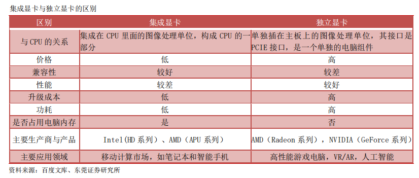 集成 GPU 由于设计制作、驱动程序都由 CPU 厂家完成,因此兼容性较好;此外,由 于 CPU 与 GPU 实现了集成,因此,集成 GPU 的占用空间小;实现 GPU 与 CPU 的适配与兼容,集成 GPU 的性能相对独立 GPU 较弱,因此功耗和成本相对独立 GPU 较低。独立 GPU由于拥有独立的显存,更大的空间和更好的散热,因此在性能上面独立显卡更好;但需要额外的空间,能够满足复杂庞大的图形处理需求,并提供高效的视频编码应用。然而,强劲的性能意味着更高的耗能,独立 GPU 需要额外的供电,并且成本也更高。