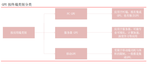 根据应用终端类别,可以分为 PC GPU,服务器 GPU,移动 GPU。PC GPU 应用于 PC 端。根据其所在产品定位既可以使用集成 GPU,也可以使用独立 GPU。例如,若 PC 以轻办公,文字编纂为主,一般产品会选择搭载集成 GPU;若 PC 需要制作高清图片,编辑视频,渲染游戏等,则选择的产品搭载独立 GPU。服务器 GPU 应用于服务器,可做专业可视化、计算加速、深度学习等应用,根据云计算、人工智能等一系列技术的发展,服务器 GPU将会以独立 GPU 为主。