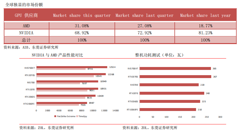 独立CPU领域,AMD奋起直追。AMD 推出的Radeon 系列部分型号采用 7nm 工艺,并且在与 NVIDIA 的产品对比中(RTX2070 对标RX5700,RTX2070S 对标 5700XT),同系列 AMD 性能略强,价格更低,重点是功耗一样。更强的性能,更低的功耗,AMD 的产品无疑对 NVIDIA 的市场份额造成了挑战。