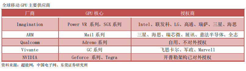 五雄争霸,手机厂商不甘寂寞。在移动 GPU 领域,主要以 Imagination、ARM、Qualcomm、Vivante、NVIDIA 为主。高通目前是 Android 阵营最大的处理器供应商。移动端主要使用集成 GPU,因此,高通 GPU 因其处理器的市场优势也有所受益。ARM Mail GPU 的主要使用者是华为和三星。ARM Mail 的 GPU 性能相对较弱,因此华为在2018年通过推出 GPUTurbo 软硬件优化弥补短板。