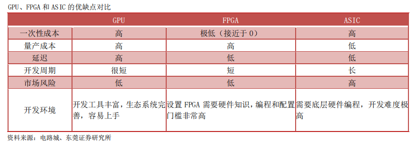 CPU适合进行逻辑控制、串行计算等通用计算;GPU 并行计算能力强,但是无法单独工作,必须由 CPU 进行控制调用才能工作;FPGA 适用于多指令,单数据流的分析,因此常用于预测阶段,如云端。但是 FPGA 在实现复杂算法方面有一定的难度,运算量相对 GPU 小,量产成本高;ASIC 专用性强,但是开发周期较长,开发环境需要底层硬件编程,开发难度极高。
