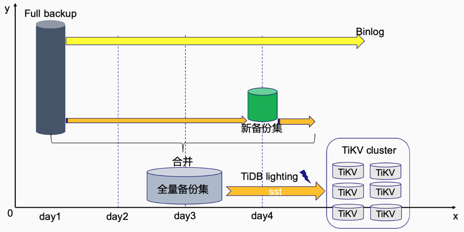 我们可以将增量备份中的 insert 语句前置到全量备份集中,全量备份集配合 Lightning 工具 急速导入到下游 TiKV 集群,Lightning 恢复速度是逻辑恢复的 5 - 10 倍 ,再加上一份更轻量的增量备份集 (update+delete) 直接实现 PITR 功能。