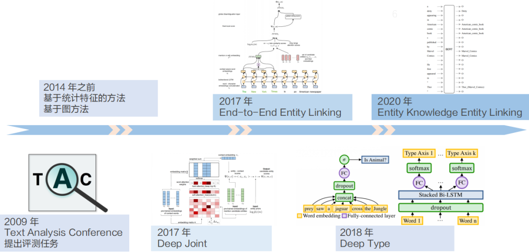 2009年在TAC会议上第一次提出实体链接任务,2014年深度学习流行之前都是通过统计特征和基于图的方法进行实体链接。2017年提出了Deep Joint方案,使用Attention结构进行语义匹配来实体消歧。后面该团队通过模型结构创新,实现了同一个模型同时实体识别和消歧,消歧依旧使用Attention。2018年提出了Deep Type方案,将消歧问题转化为实体分类,得到实体类别后,通过Link Count确定要链接到的实体。2020年预训练语言模型开始流行,Entity Knowledge方案借助大量的语料和强大的预训练模型,用序列标注的方式进行实体链接。