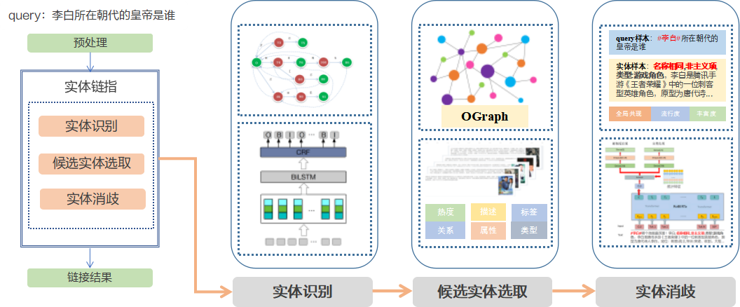 实体链接通常会被拆分为三个子任务:实体识别、候选实体召回、实体消歧。