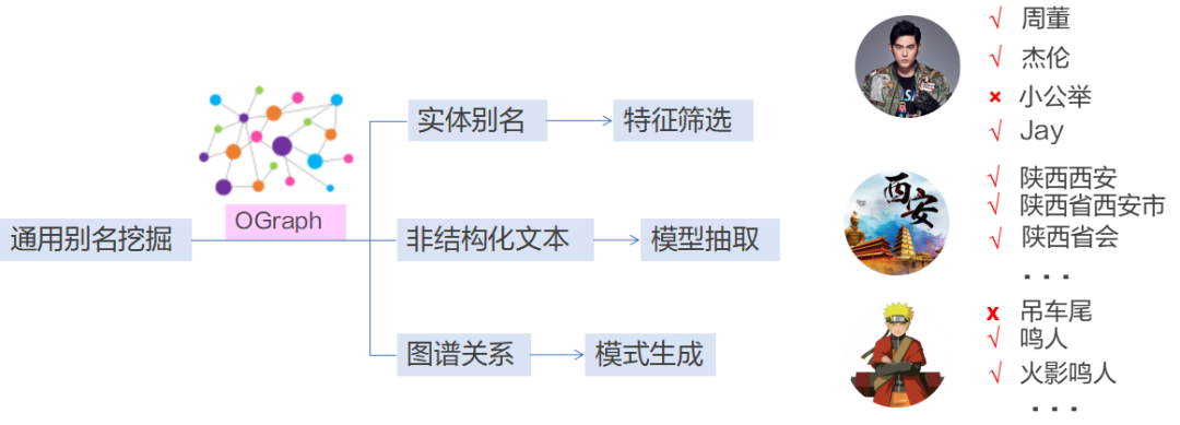 根据问题的特点,我们构建了两套方案,通用别名挖掘采用信息抽取为主模式生成为辅的挖掘流程,充分利用OGraph中的描述信息、别名信息和关系信息,从中挖掘别名。