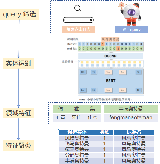 2)实体识别:使用实体识别技术,从待挖掘query中识别实体。实体识别模型采用通用实体识别模型+垂域finetune的方式得到。