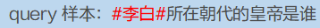 query样本构造:query样本输入时关键时将mention的位置信息传入模型,让模型能判断mention在query中的具体位置。因此引入标识符#将,在mention两边加入统一的标识符“#”,样本如下: