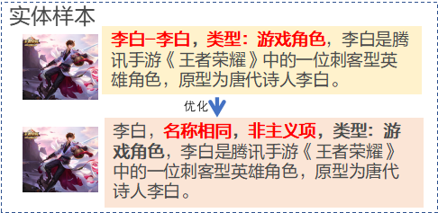 实体描述样本构造:实体样本中需要包含待消歧实体的特征,我们在第一版实体样本中设计了mention和标准名的拼接表示标准名和mention是否相同这一特征;构造了“类型:实体类型”这种描述,提供实体类型信息;同时加入了实体描述和图谱的三元组信息。在第二版中,我们将标准名和mention是否相同的特征直接转化成文本描述“名称相同/不同”,同时加入了“非/是主义项”这一特征,通过优化特征表达方式,模型表现提升约2%。