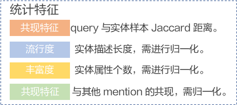 统计特征样本构造:为了避免消歧模型只关注语义特征,我们统计了query和实体样本共现特征、流行度、丰富度、mention共现特征等统计特征,作为模型输入,辅助进行全局消歧。