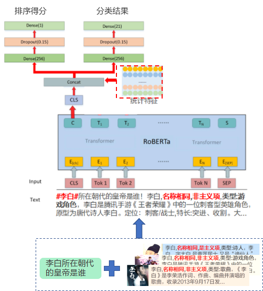 最终我们模型结构如下,将query样本和实体样本拼接,输入预训练语言模型,将CLS位置的向量和统计特征embedding拼接后作为特征向量。排序任务将特征向量输入全连接层,然后经过tanh最终输出[-1,1]区间的分数,分数越高代表越有可能是目标实体。分类任务将特征向量输入全链接层,经过softmax层输出各个分类的得分。