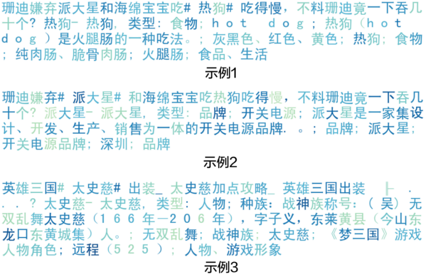 为了了解模型到底关注哪些输入特征,使用互信息的可视化方法对模型进行可视化,对各个词的重要程度进行了可视化,颜色越深重要程度越高。通过可视化发现,模型倾向于关注实体的类型和用来区分实体的片段,例如示例1吃得慢、食物、吃法、火腿肠,示例2中的珊迪、海绵宝宝、开关电源品牌。示例3种的人物、种族、梦三国等,可以看到多任务模型关注的特征都是对消歧有帮助的。
