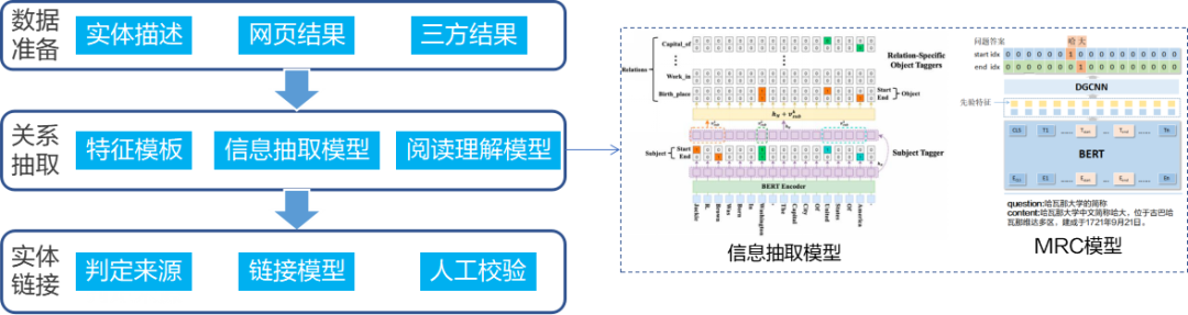 实体链接不仅可以应用到KBQA,在信息抽取流程中也是至关重要的一环。Ograph信息抽取流程使用了信息抽取模型Casrel和专门针对实体类问题训练的MRC模型,可以获得海量候选三元组。