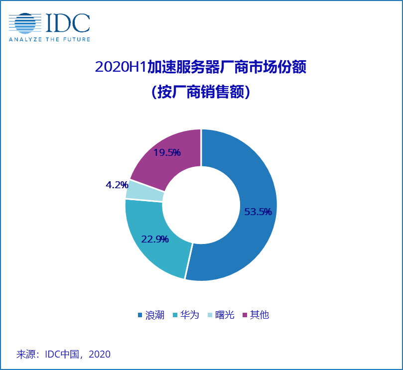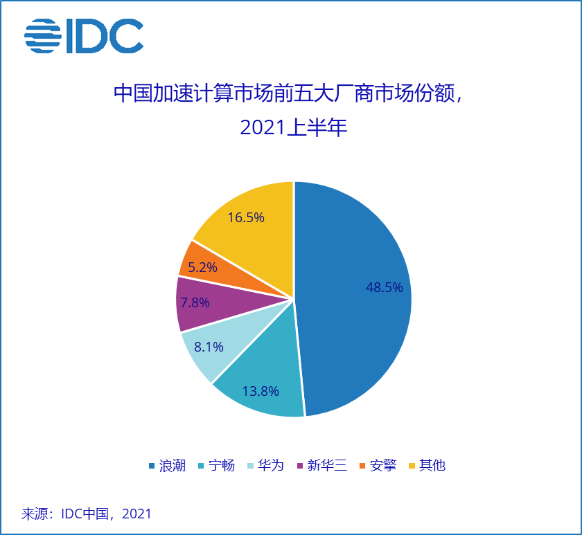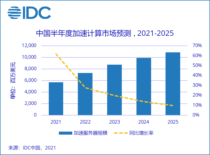 2021年10月11日,IDC 发布了的《中国半年度加速计算市场(2021上半年)跟踪》报告显示:2021年上半年加速服务器市场规模达到23.8亿美元(153.2亿人民币),同比增长85.1%。其中GPU服务器依然占主导地位,占据91.9%的市场份额,达到21.9亿美元,同比增长82.2%。同时NPU、ASIC 和 FPGA等非GPU加速服务器以127.1%的增速占有了8.1%的市场份额,达到1.9亿美元。2021年上半年,从厂商销售额角度看,浪潮、宁畅、华为位居前三,占据了70%的市场份额;从服务器出货量角度看,浪潮、宁畅、安擎位居前三名,占有60%以上的市场份额。从行业的角度看,互联网依然是最大的采购行业,占整体加速服务器市场60%以上的份额,同比2020年有90%以上的增长。此外金融、服务、电信、制造和能源行业均有超过50%的上涨。从加速卡的角度看,2020年的采购主要集中在搭载V100、V100S、A100和T4的加速服务器上,同时Nvidia发布了A10、A30、A40等新型号加速卡部分领域已经开始使用。IDC调研发现,2021上半年,用于推理工作负载的加速服务器已经达到53.5%,预计到2025年将超过60%。IDC预测,到2025年中国加速服务器市场规模将达到108.6亿美元。其中GPU和非GPU服务器市场规模分别为82.9亿美元和25.6亿美元。