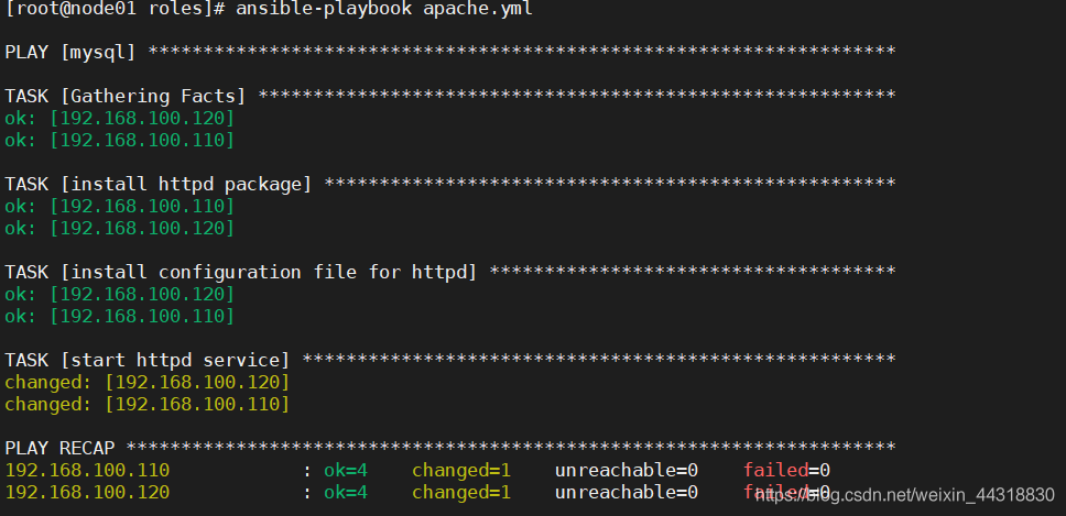 假如说某个时刻httpd.conf发生改变了,比如说不再监听在80,而是监听在8080端口,其他没变。修改/root/conf/httpd.conf,把端口改成8080,再执行这个playbook: