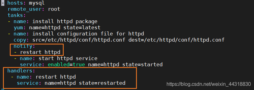 "notify"这个action可用于在每个play的最后被触发,这样可以避免多次有改变发生时每次都执行指定的操作,取而代之,仅在所有的变化发生完成后一次性地执行指定操作。在notify中列出的操作称为handler,也即notify中调用handler中定义的操作。