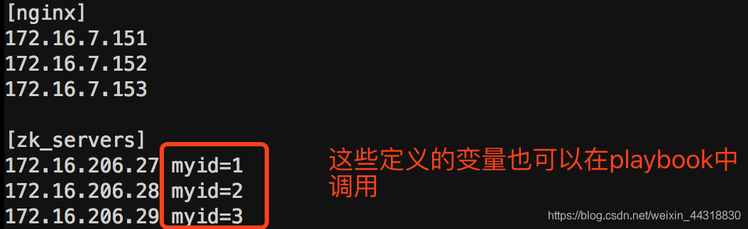 另外,在inventory中定义的变量也可以在playbook中调用。例如: