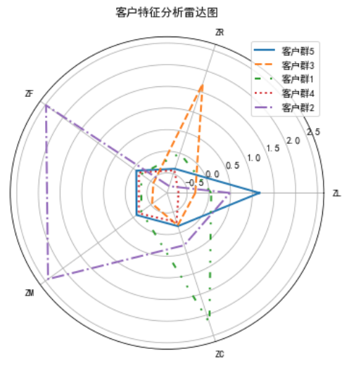 %matplotlib inline import matplotlib.pyplot as plt # 客户分群雷达图 labels = ['ZL','ZR','ZF','ZM','ZC'] legen = ['客户群' + str(i + 1) for i in cluster_center.index] # 客户群命名,作为雷达图的图例 lstype = ['-','--',(0, (3, 5, 1, 5, 1, 5)),':','-.'] kinds = list(cluster_center.iloc[:, 0]) # 由于雷达图要保证数据闭合,因此再添加L列,并转换为 np.ndarray cluster_center = pd.concat([cluster_center, cluster_center[['ZL']]], axis=1) centers = np.array(cluster_center.iloc[:, 0:])