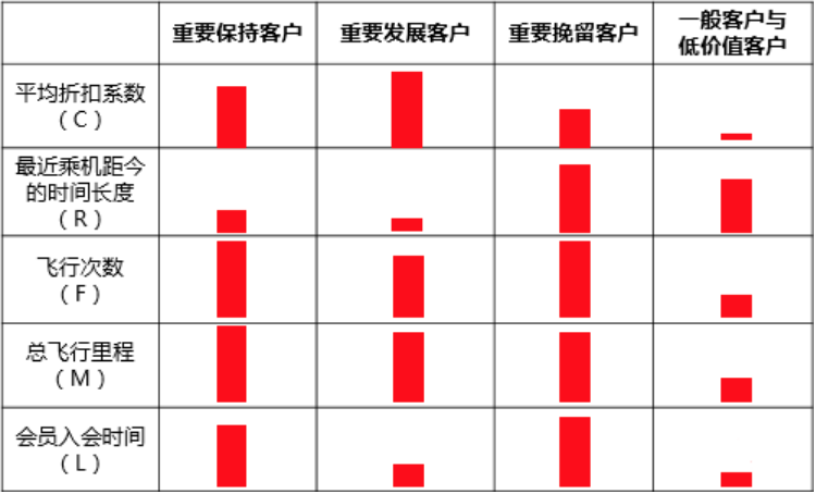 (4) 一般与低价值客户。这类客户所乘航班的平均折扣率(C)很低,较长时间没有乘坐过本公司航班(R)高,乘坐的次数(F)或里程(M)较低,入会时长(L)短。他们是航空公司的一般用户与低价值客户,可能是在航空公司机票打折促销时,才会乘坐本公司航班。