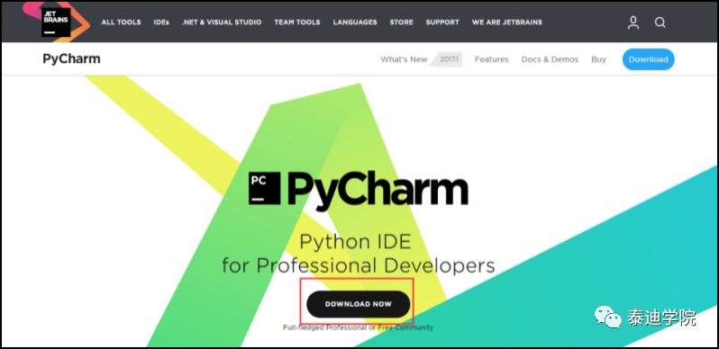 打开PyCharm的官网,网址如下(https://www.jetbrains.com/pycharm),如图 1-1所示,单击“DOWNLOAD NOW”位置。