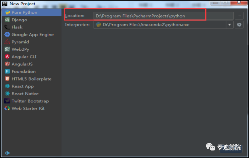 自定义项目储存路径,IDE默认关联Python解释器,单击“Create”按钮,如图 1-10所示。