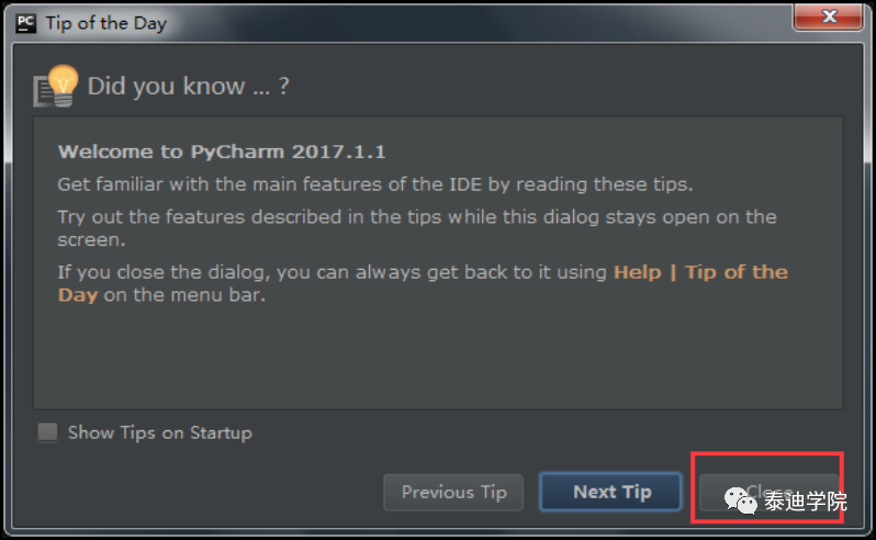 IDE提供的提示,可以选择在启动时不显示提示,如图 1-11所示,单击“Close”按钮。