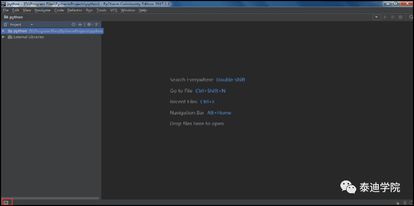 这样就进入了PyCharm,界面如图 1-12所示,单击左下角的符号可显示或隐藏功能侧边栏。下面简单介绍怎么使用PyCharm。